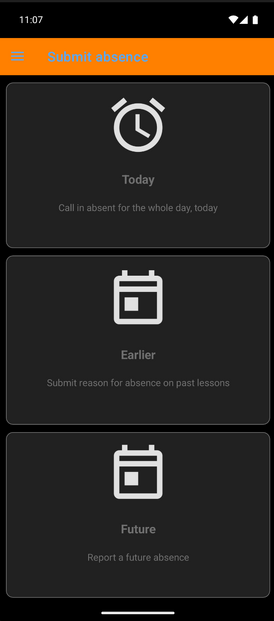 The page "Report absence" has 3 options